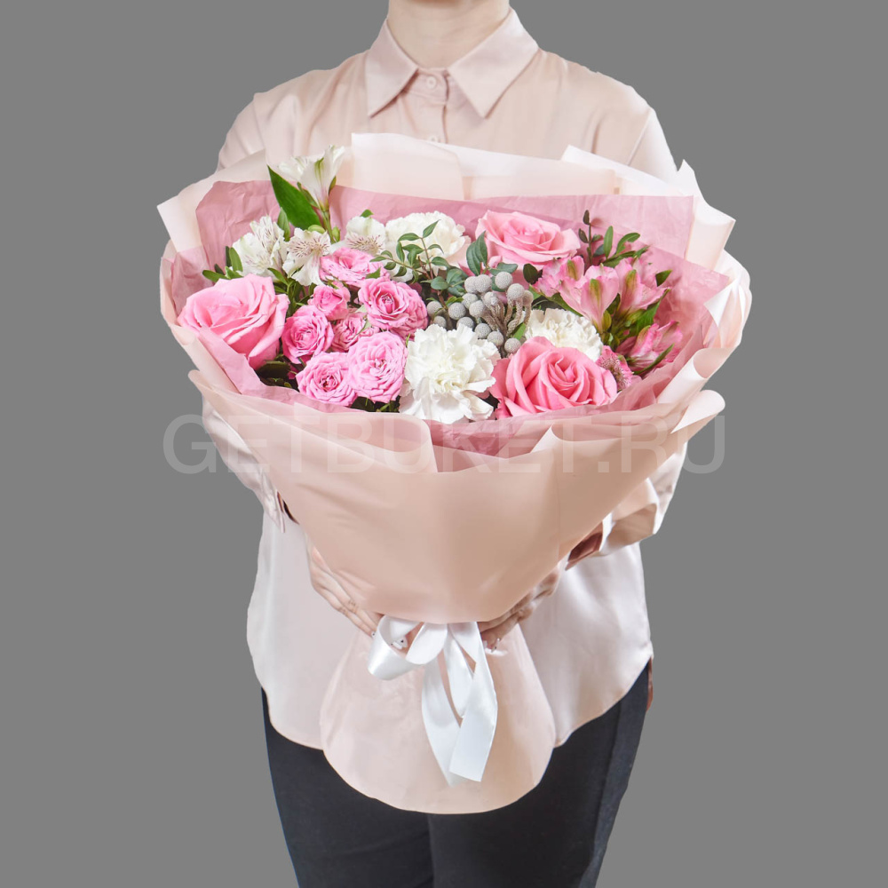 Нежный букет из розовых роз, белых гвоздик и альстромерии