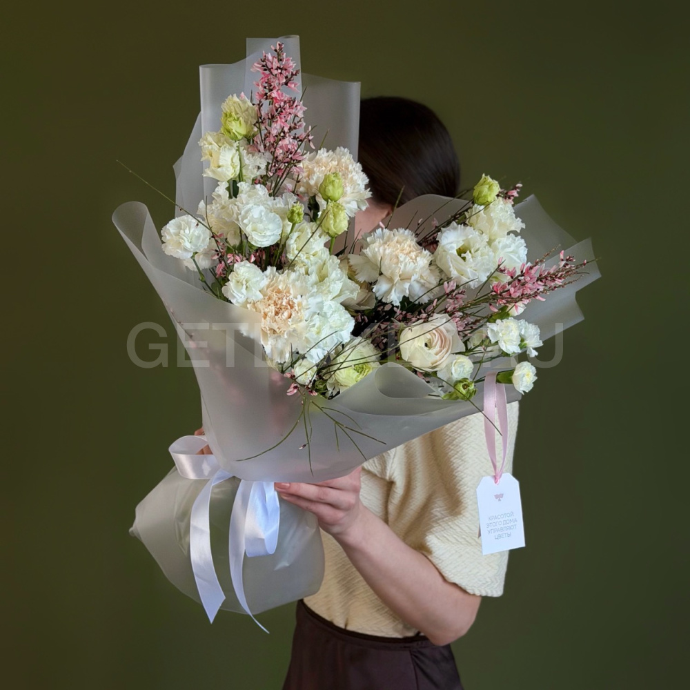 Букет с генистой, кустовой гвоздикой и эустомой