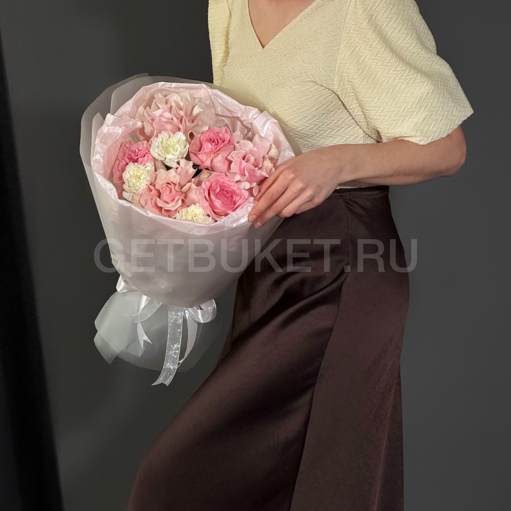 Букет розовых роз с гвоздиками Роза - 3 шт.